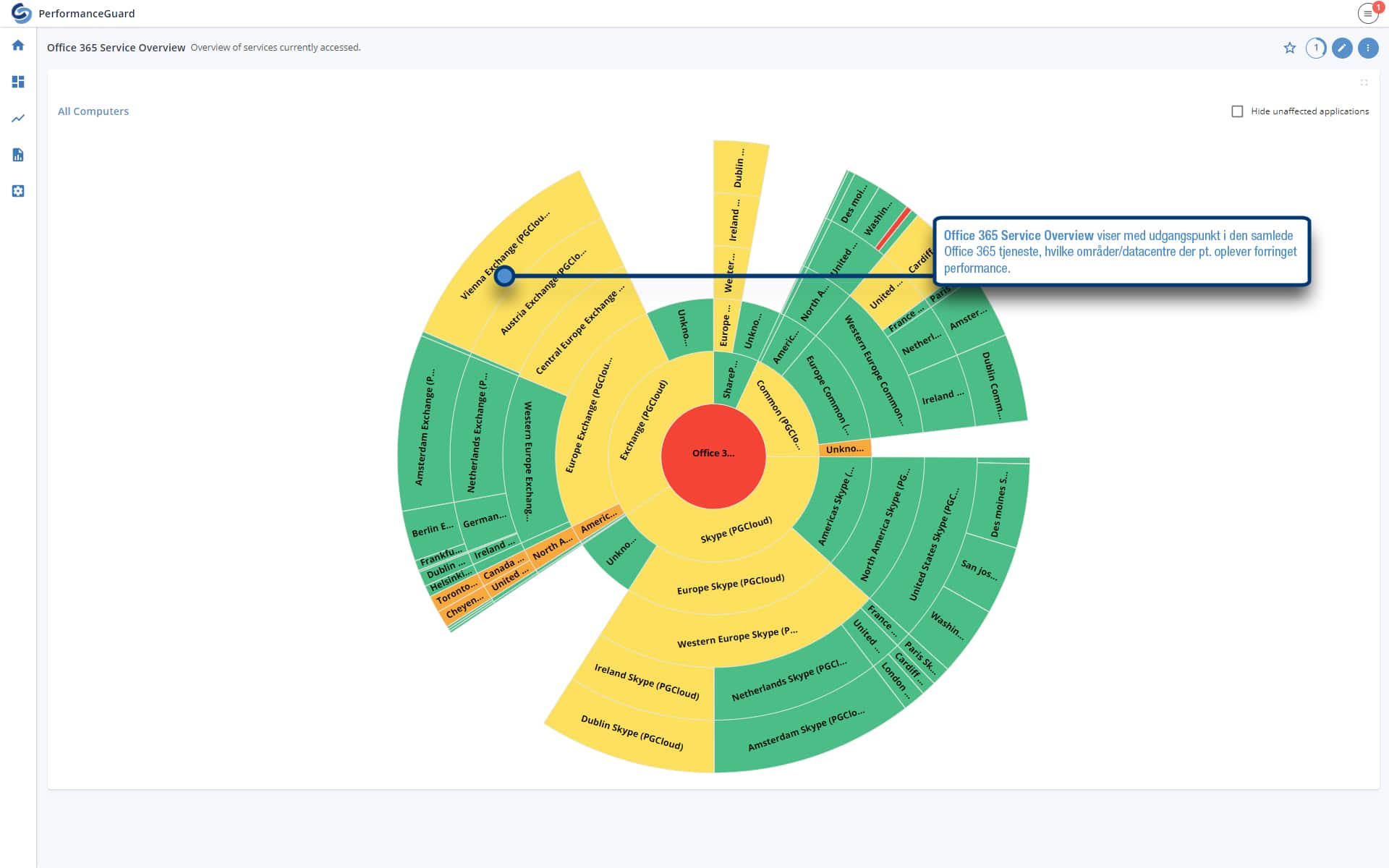 Servicen PerformanceGuard – Office 365 består af tre dashboards, som integreres i den eksisterende PerformanceGuard-installation.